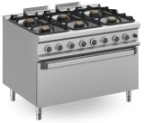 Cocina a gas con horno MAXI GN2/1 con válvula termostática de 6 fuegos 2x8+4,5+3x6 Kw Serie 900 JUNE